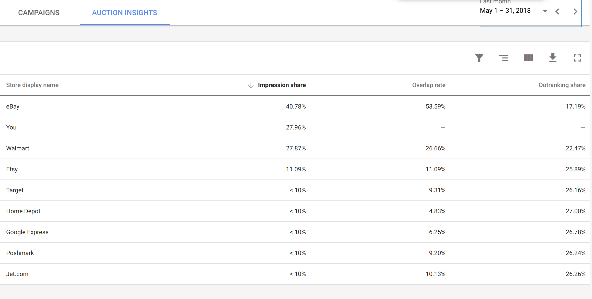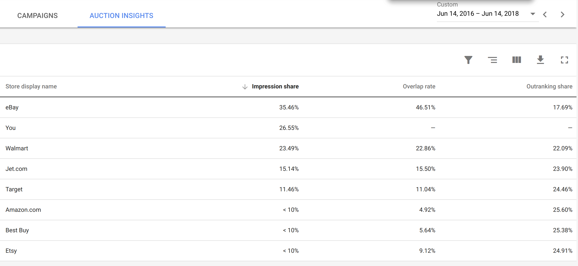 Work research: Two year impression shares vs last month impression shares indicate eBay is up 5%. Searching the database shows corresponding growth.