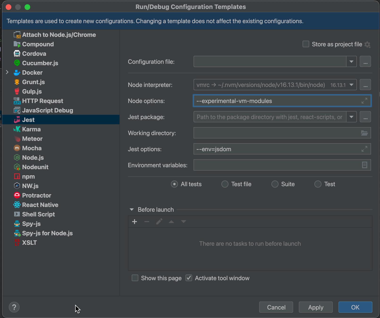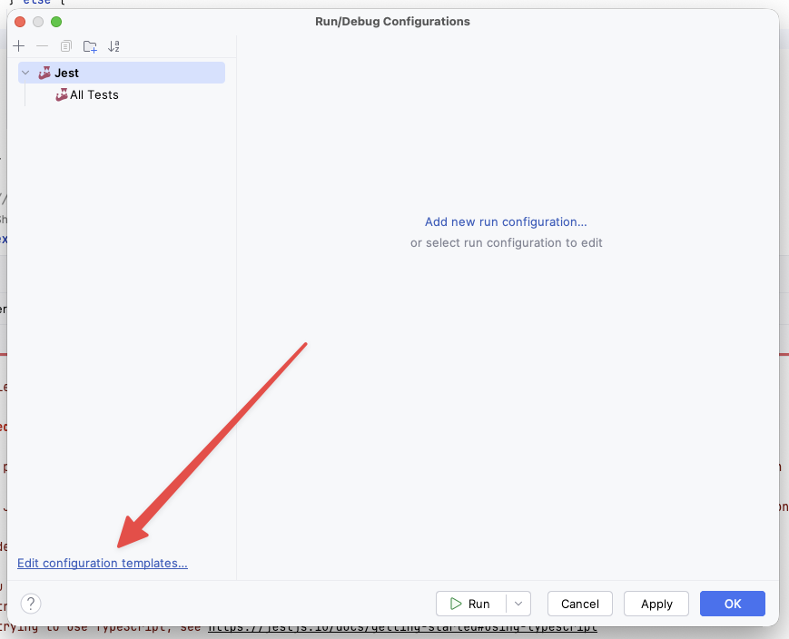 Pick "Edit configuration template", from lower left corner (not just "Add new run configuration"). Then ensure the Jest configuration looks like this: