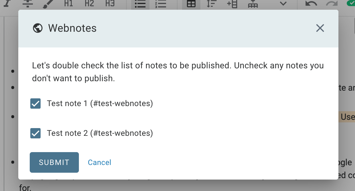 let answer = await app.prompt("Let's double check the list of notes to be published. Uncheck any notes you don't want to publish.", {