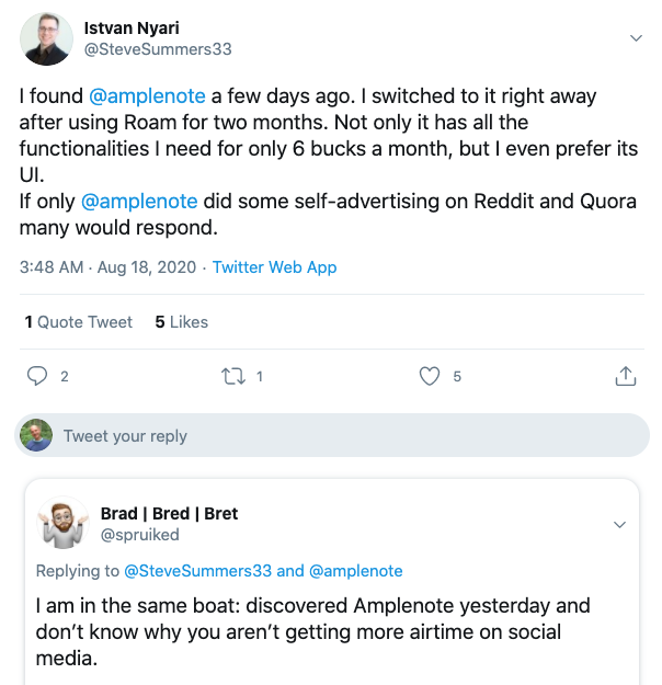 Our reckoning is that Amplenote's lack of growth is probably some combination of us spending too much time building our product, and too little time getting Twitter hyped up about it. It doesn't help our cause that so many of the experts in the field, who might normally take interest in an interesting new product, have almost exclusively covered Roam for almost a year now. Not difficult to imagine that certain allegiances have taken shape during this period.