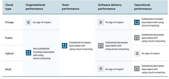 We see strong indicators that public cloud leads to decreased software and operational performance unless teams make use of flexible infrastructure. This finding further promotes the idea that simply “lifting and shifting” (the act of shifting workloads from a data center to the cloud) is not beneficial and can be detrimental.