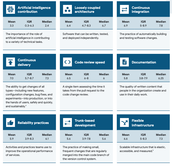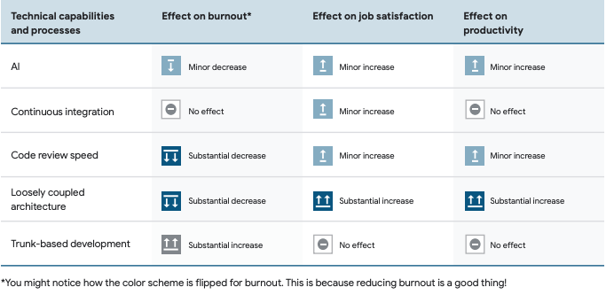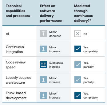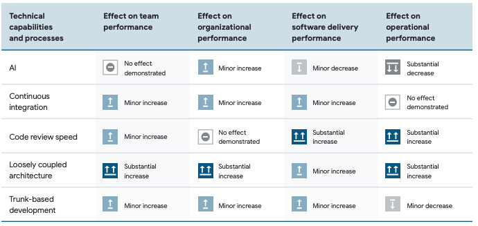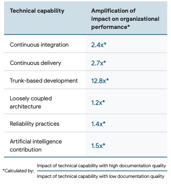 Trunk-based development, for example, is estimated to have 12.8x more impact on organizational performance when high-quality documentation is in place relative to low-quality documentation.