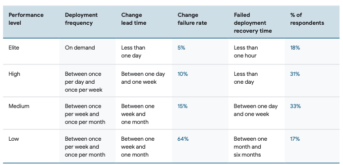 The four DORA metrics that have been tracked since the beginning are presented in this section: