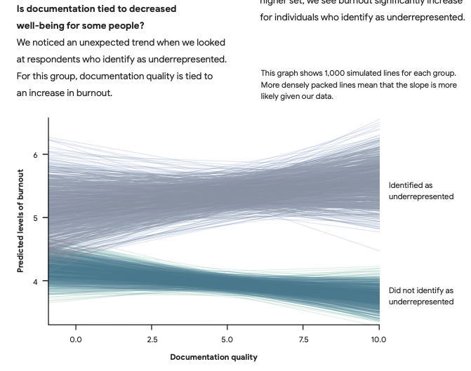 Is documentation tied to decreased well-being for underrepresented groups? More high quality documentation is somehow tied to greater levels of burnout, which is a most vexing finding, since documentation seems to be a strong net benefit.