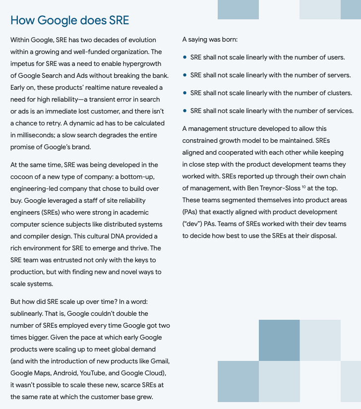 But how did SRE scale up over time? In a word: sublinearly. That is, Google couldn’t double the number of SREs employed every time Google got two times bigger. Given the pace at which early Google products were scaling up to meet global demand (and with the introduction of new products like Gmail, Google Maps, Android, YouTube, and Google Cloud), it wasn’t possible to scale these new, scarce SREs at the same rate at which the customer base grew.