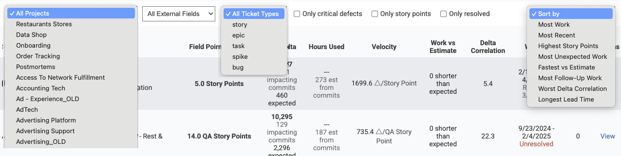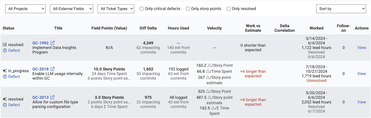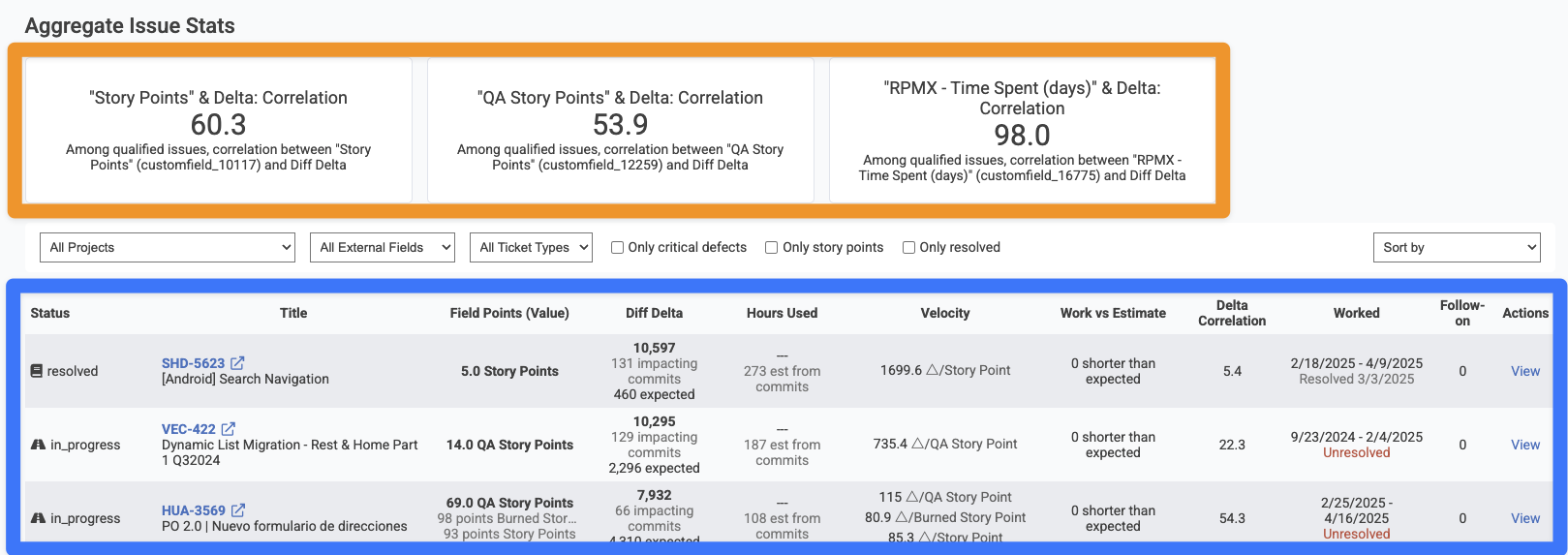 Worst Delta Correlation. Which issues had the lowest similarity between Story Points (or the chosen external field) and Diff Delta? A mismatch between ticket value and measured developer output often suggests tech debt or opportunities to improve the effort estimation process.
