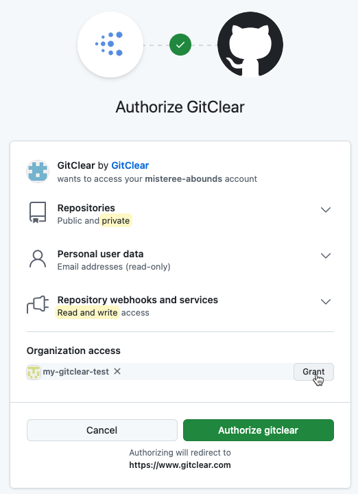 If you do not click the "Grant" button upon logging in, and then try to import a repo from that organization on GitClear, your repo import will fail. To remediate the error, you need to visit your personal account on GitHub and designate "GitClear" as an app that should get access to the desired organization. This GitHub help page has instructions for how to accomplish this.