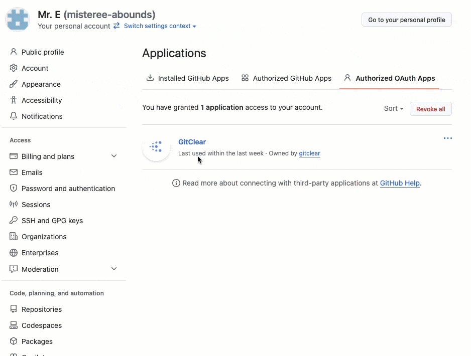 From the "Applications" settings page, click the tab for "Authorized Oauth Apps"
