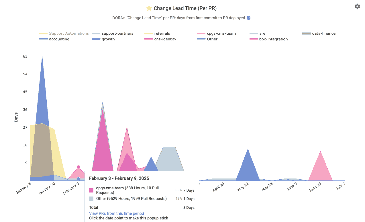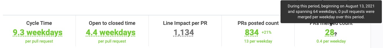 According to Google DORA and others, Cycle Time should be one of the primary metrics that a team seeks to reduce in pursuit of being able to respond more quickly once they decide what they want to work on. Hovering on the tooltip for Cycle Time will reveal the data that we used to calculate this stat, so you're not left in the dark wondering about which data was used for the calculation. "Cycle Time" in the context of the Pull Request stats means "how much time passed between the first commit for the PR and when it was merged."