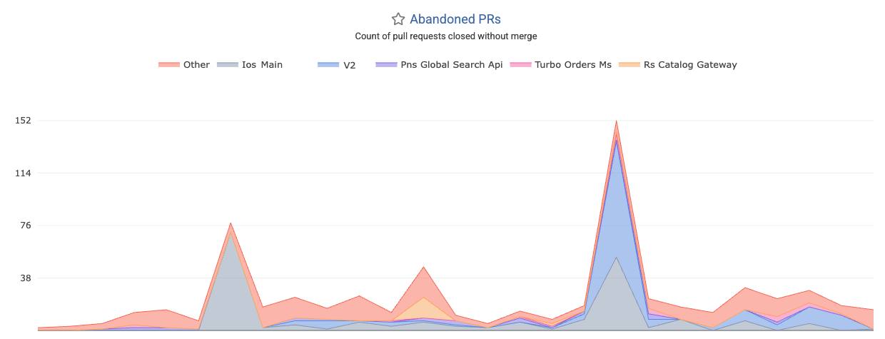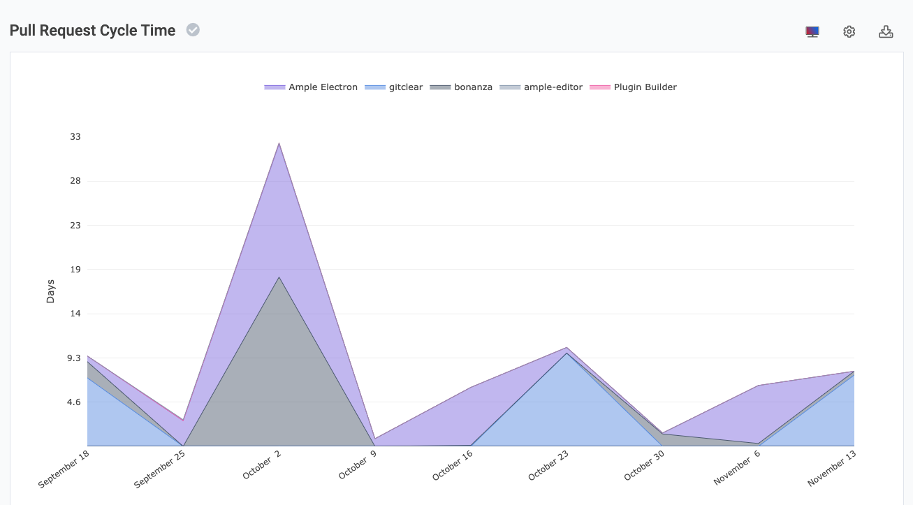 So, in the graph above, the spike in "Pull Request Cycle Time" that is seen for the week of October 2nd indicates that the average pull request that was closed within the gray (= "Bonanza" repo) segment, between October 2nd and October 8th, took 18 weekdays from the time of first commit, to when the pull request was merged.