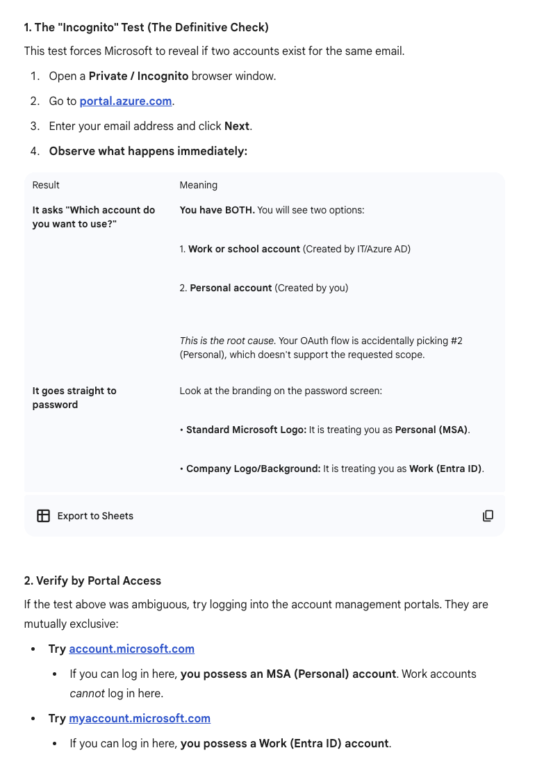 When a user logs in with an Azure account that has a personal tenant (e.g., "Microsoft Account" on the tenant selection screen), Microsoft's fails to allow login because the "Account Impersonation" permission that Microsoft recommends to grant repo access is not available to "Personal" account types. The way that Microsoft communicates this limitation is by failing to recognize a "personal" Azure account when logging into the default ("common", aka the tenant you get if you leave the field blank when prompted for your Azure tenant during login) endpoint.