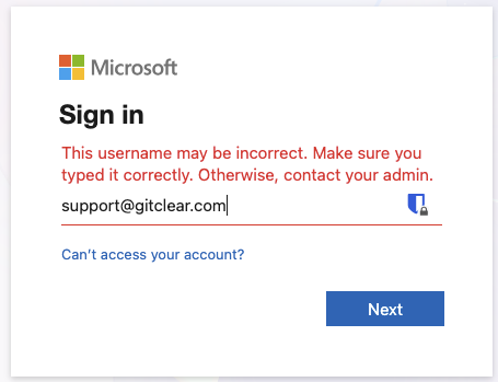 When logging in to GitClear, specify the tenant ID for your "Default Directory" (non-Personal, Entra-connected) tenant. See the section above on "Ensure your account has a Default Directory tenant"