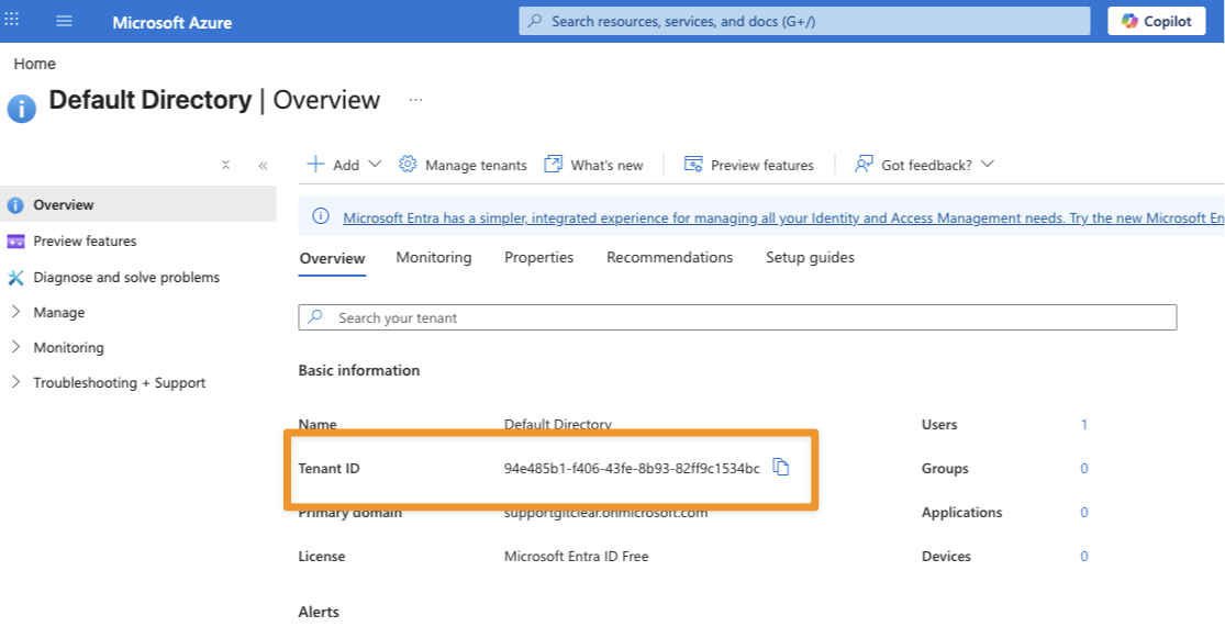 Once you've set up organizations within your Default Directory, you will need to copy the tenant ID of your "Default Directory" account. To retrieve your tenant ID, visit the Microsoft Azure Portal, click "Overview" (if not already selected) and click the "Copy" icon next to "Tenant ID"