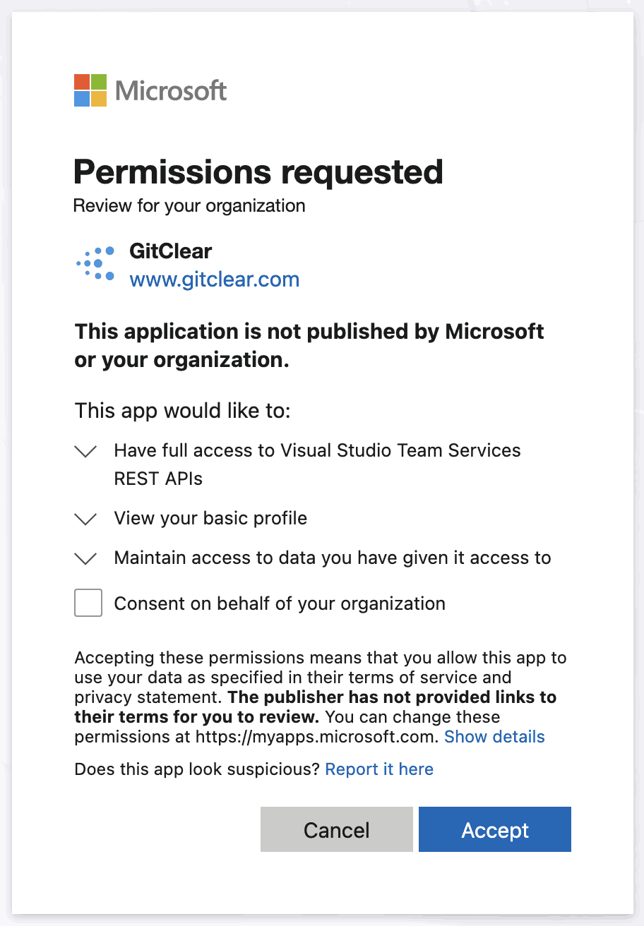 For most Azure users that log in to GitClear, no special configuration should be necessary. All you'll need to do to login is to agree to the permissions that are presented by Microsoft: