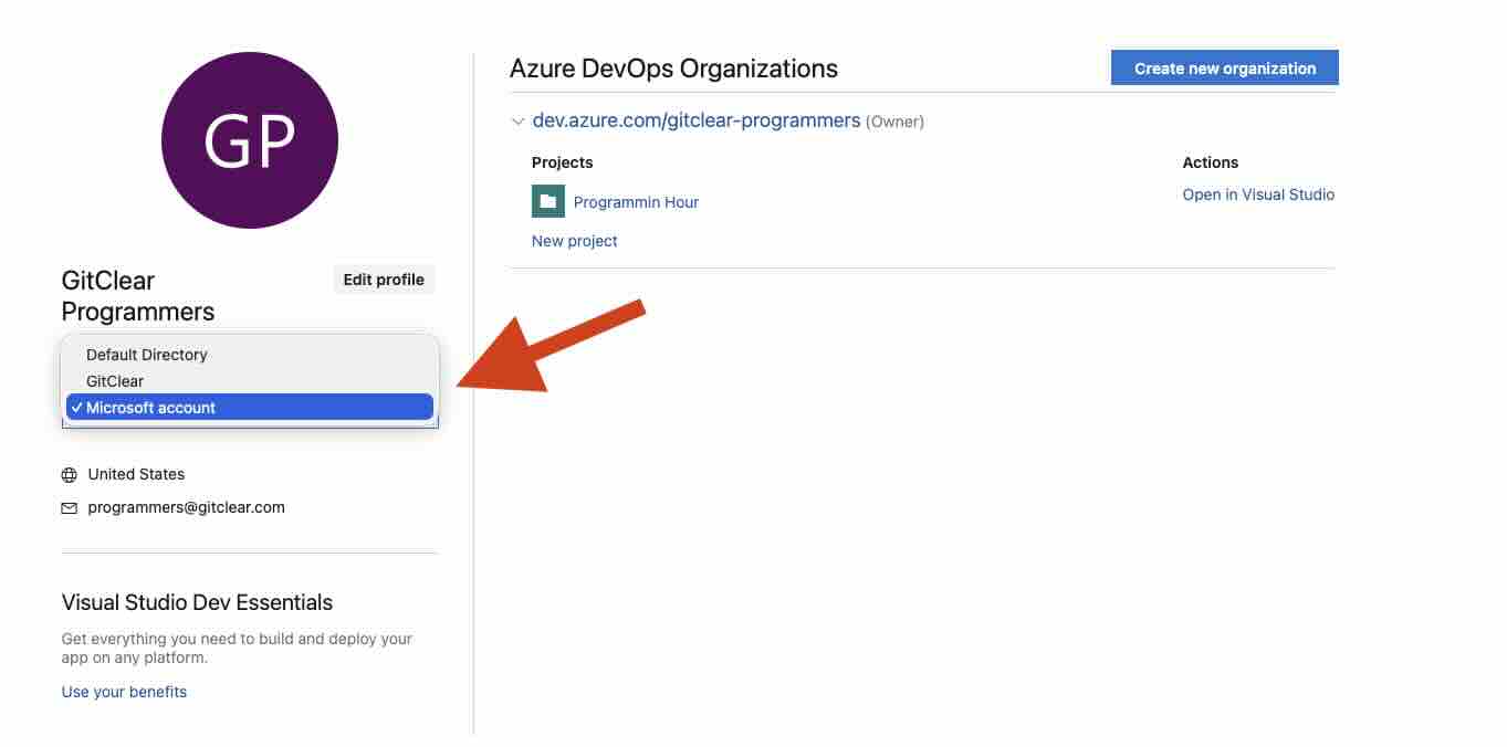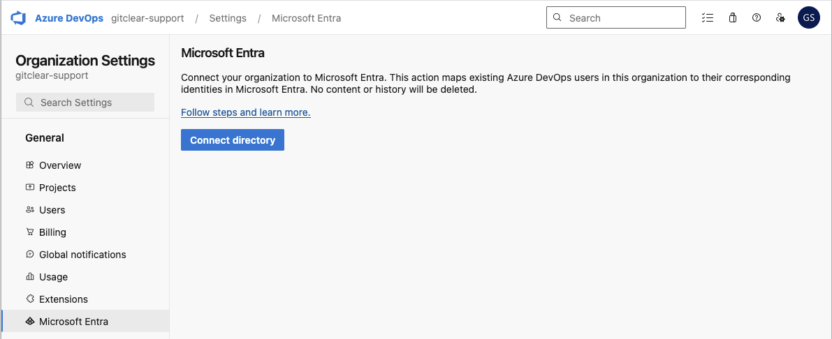 Clicking "Connect directory" will initiate the process to make your organization available to external services like GitClear. The "Connect Directory" button typically offers to connect the organization from your personal "Microsoft Account" tenant to the "Default Directory" tenant that can be individually selected & configured from the Microsoft Tenant Selection page.