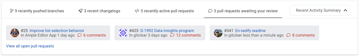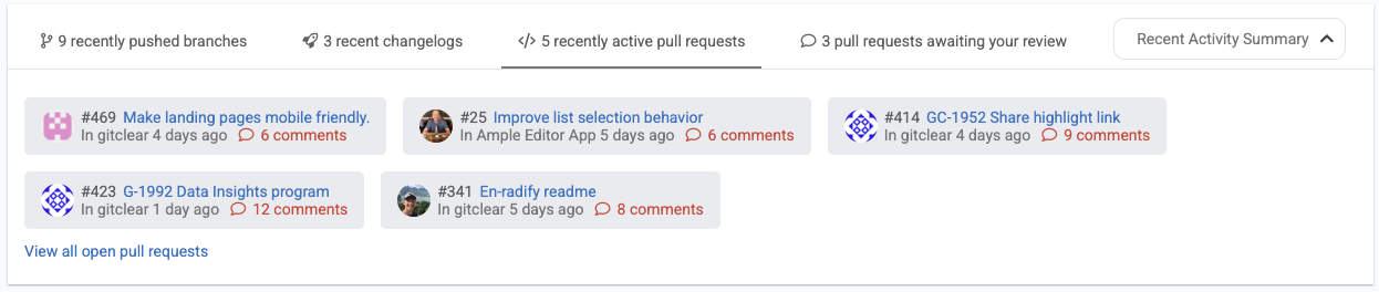 This tab is shown when the chosen team has open pull requests with activity during the past few business days.