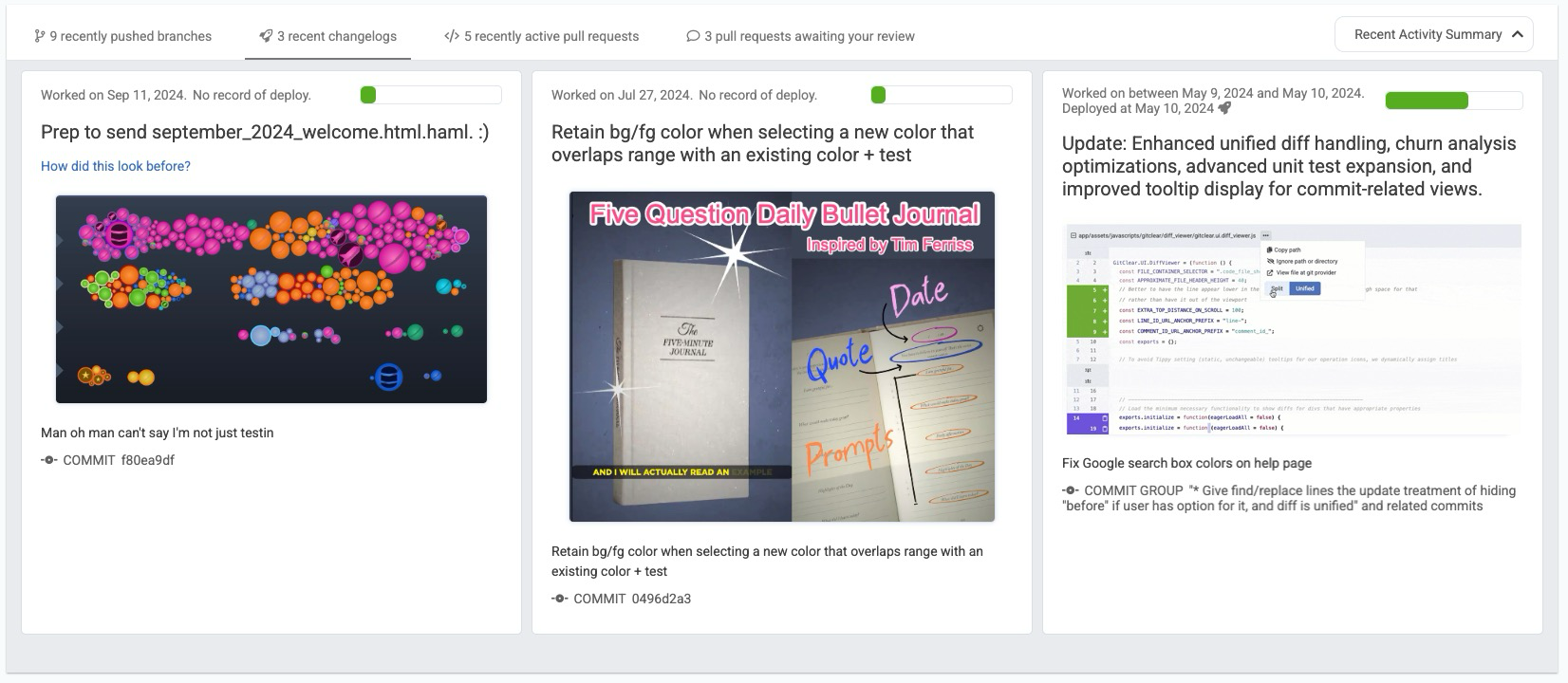 For teams that cultivate the discipline to publish their work on regular basis, the "Recent Changelogs" tab can become a stand-in to replace the disruption of daily "standup meetings" that are employed by some managers. Regardless of whether this tab manages to supplant time spent on meetings, it is a great way to help a developer remember the latest work they have implemented during the past week or month. This can seriously cut down on the time and distraction of preparing for sprint meetings, or weekly team "progress update" meetings.
