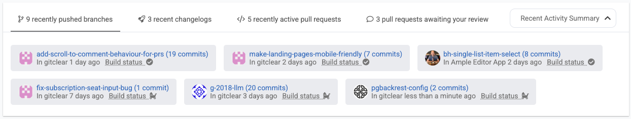 Near the top of the "Work in Review" page is a module labeled "Recent Activity Summary." You can think of this module like the "daily newspaper" for your dev team. It aggregates the most important news on what is changing, and gives you a fast & convenient way to dig into those changes.