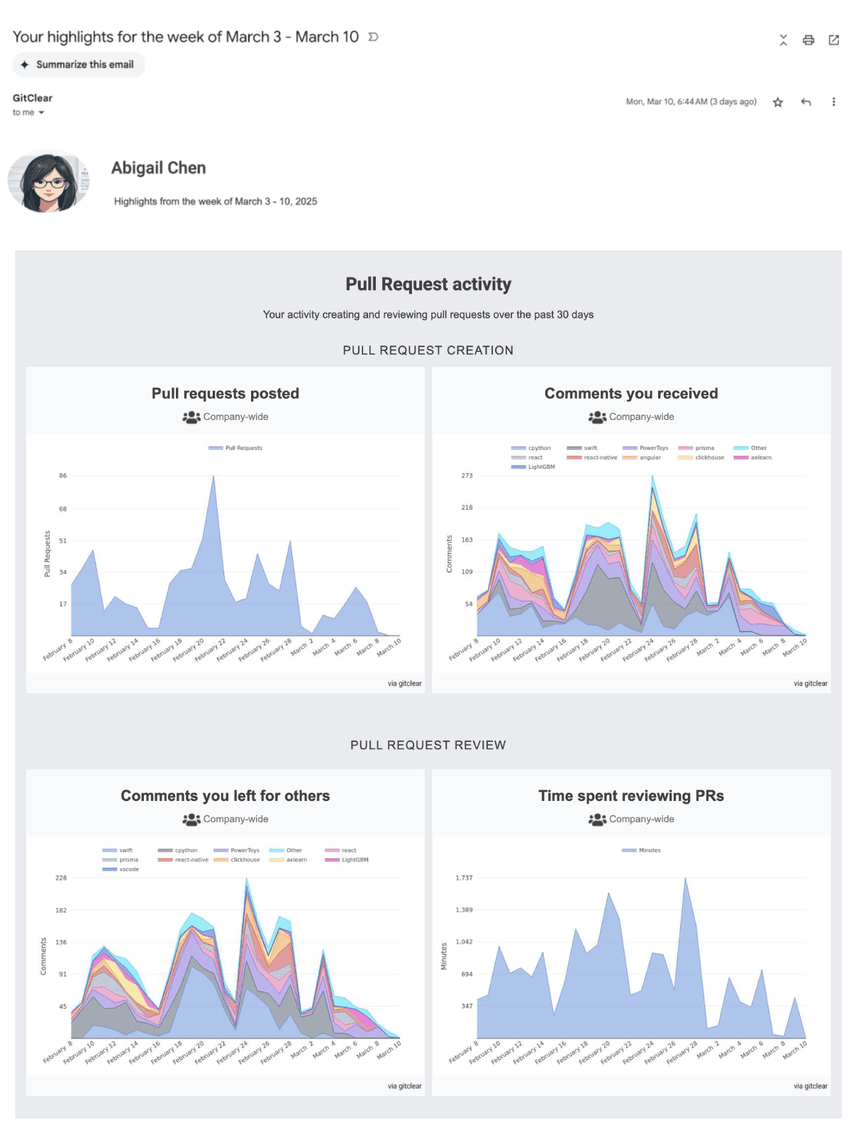 Developer that sign up for GitClear can receive emails every week to showcase their best achievements from the week prior.