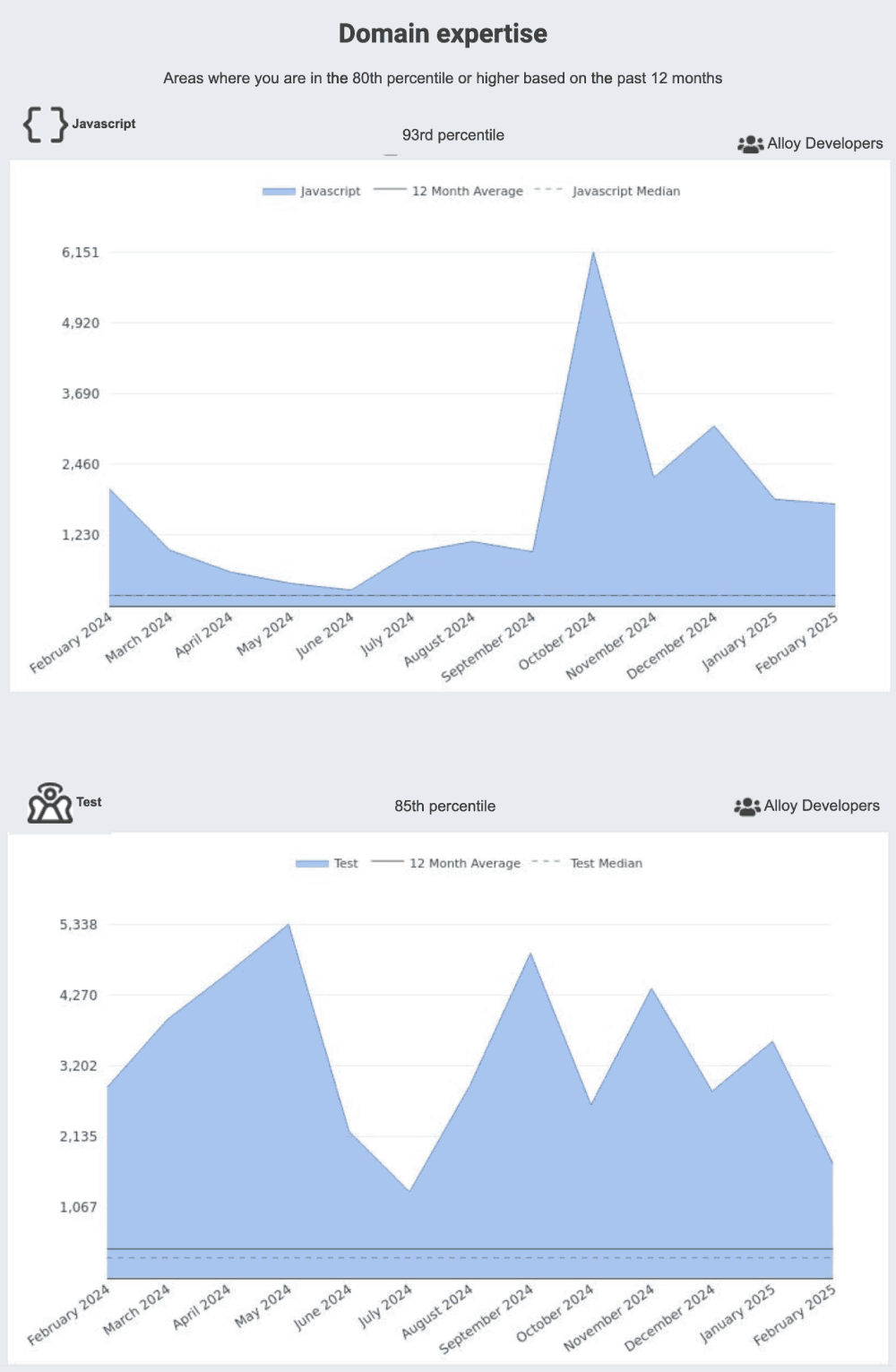 GitClear will also highlight the types of code that you have worked in the most extensively, relative to teammates. You will see notifications for any type of code where your Diff Delta output is in the 80th percentile or above.