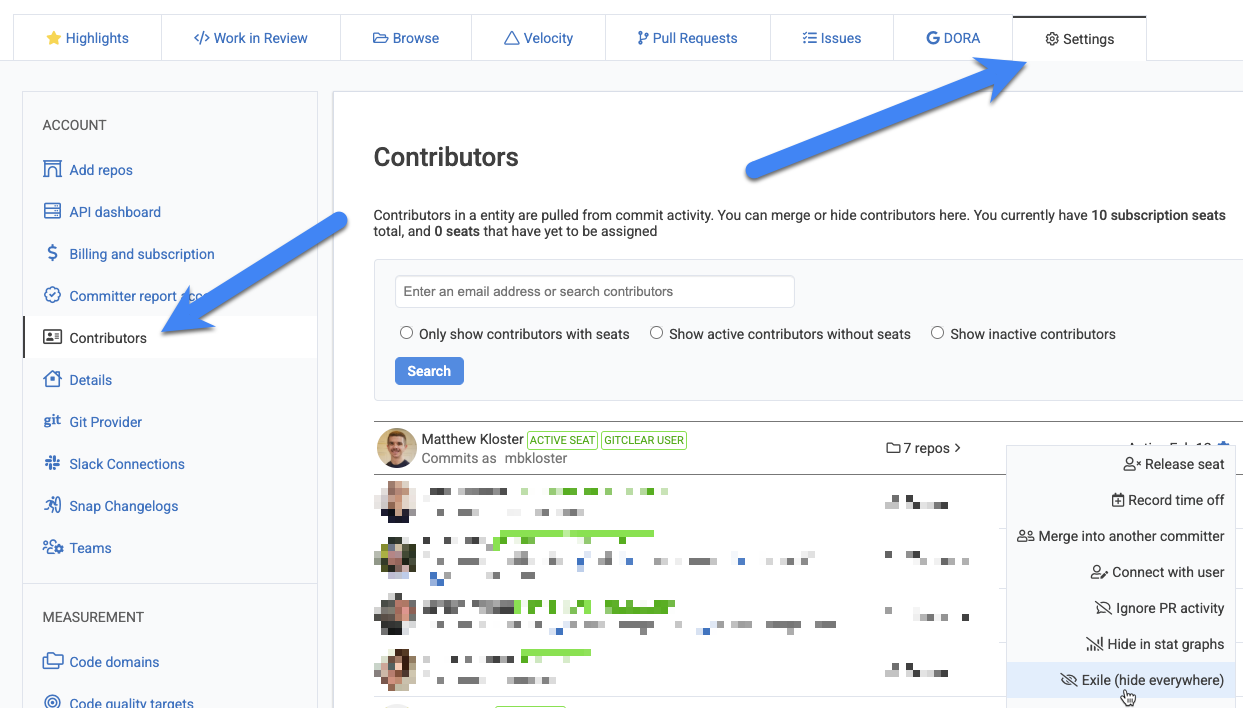 After confirming that you really want to remove the contributor from all stats and processing, their activity will no longer be processed, and your subscription seat count will be reduced during subsequent billing.