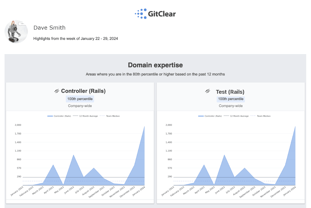 All of these new metrics help shine light onto subtle changes that might be occurring in the quality or velocity of code delivered. But, combined with ~30 other reports that GitClear offers, we recognize that it can be intimidating, especially for new users, to figure out which reports deserve attention. Enter improved Highlight emails that now include graphs and median values: