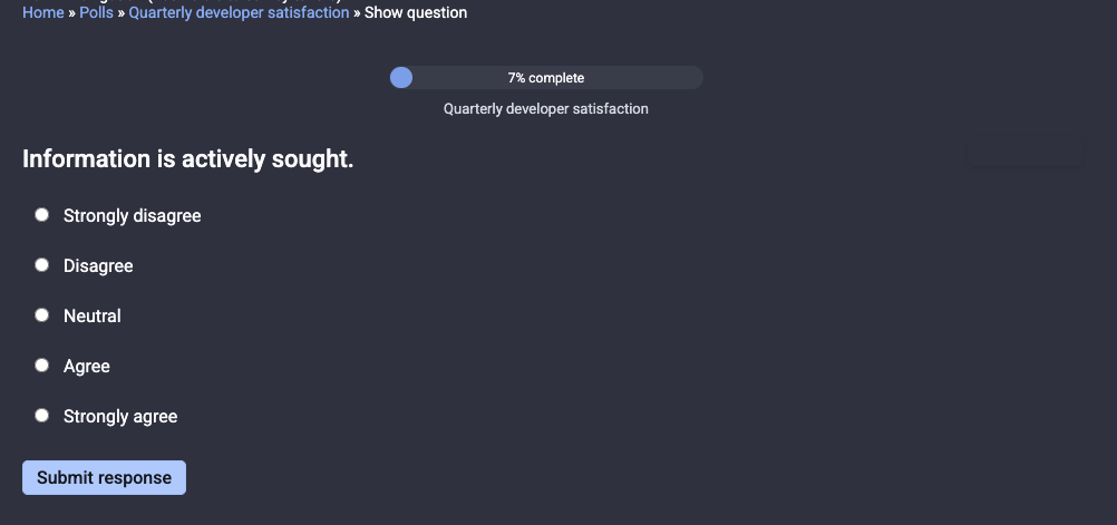 When you set a goal for Developer Satisfaction, we will periodically send you a reminder to create a new poll. As responses to your poll come in, you will receive periodic notifications in accordance with your notification settings.