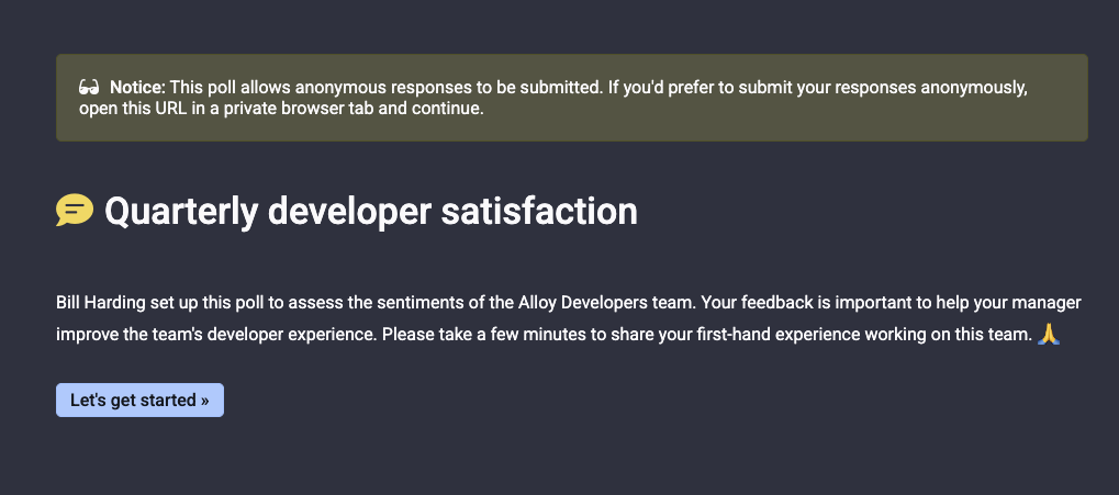 When developers receive the survey, they will be shown whether the survey is eligible to be taken anonymously, or whether it requires login: