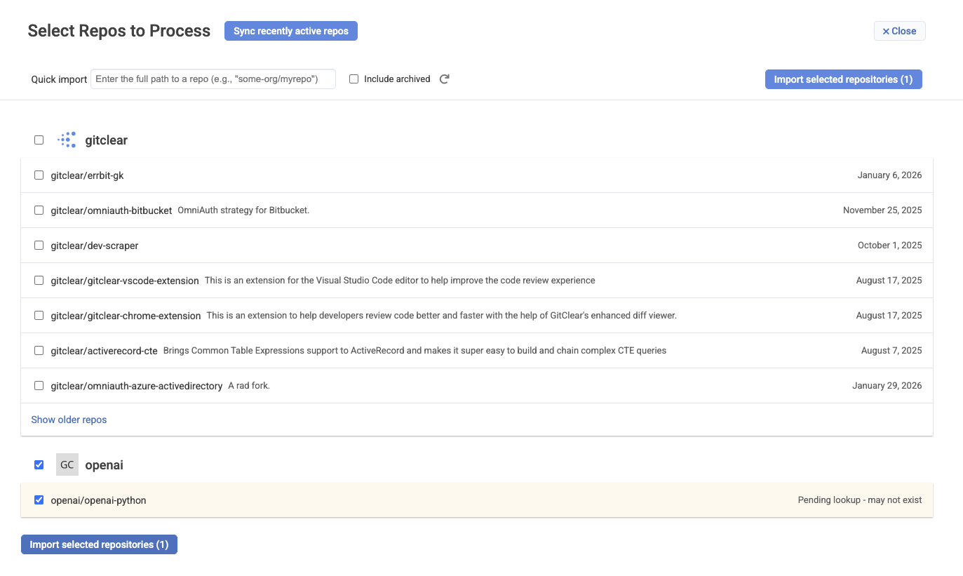 Want to process an open source repo as part of your GitClear account? No problem! You can enter the name of any Github open source repo in the "Quick import" field of the usual "Import Repos" page, available from the "Browse" tab after clicking the "Add repos" button.