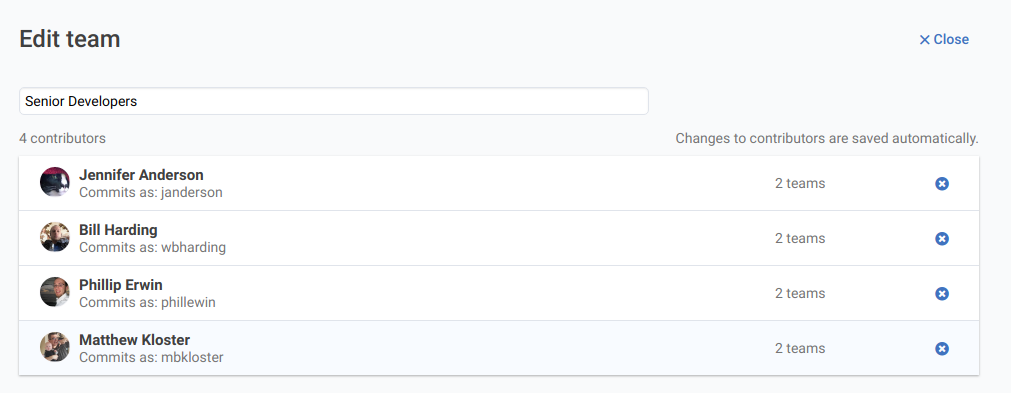 Once you've setup a team, you can apply it to any report, in any context. The selector to filter on team (or "All contributors") is presented in the upper right side of every page. Picking it applies that team to the page results. For example, let's look at the recent commits from our Senior Developers team: