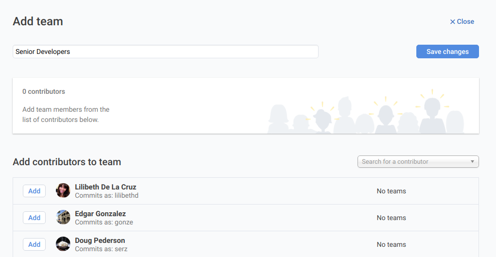 The first step in leveraging teams to compare developers is to setup the teams that your company recognizes. You can do this by visiting the "Teams" tab now available under the "Settings" menu. You'll then be presented the opportunity to name your team and add contributors: