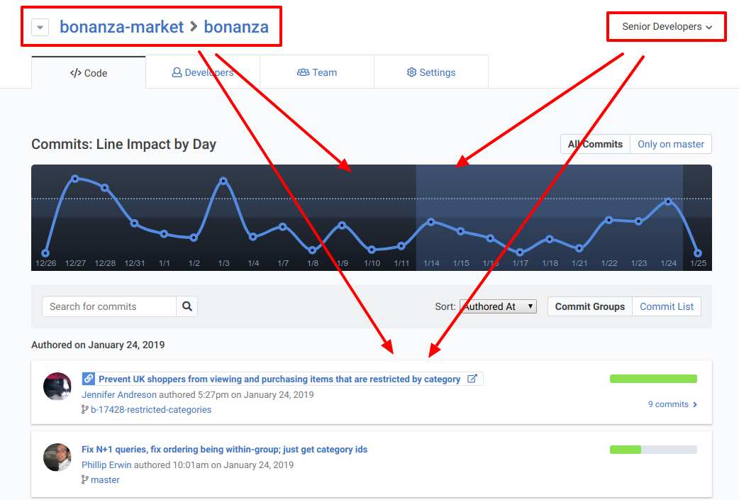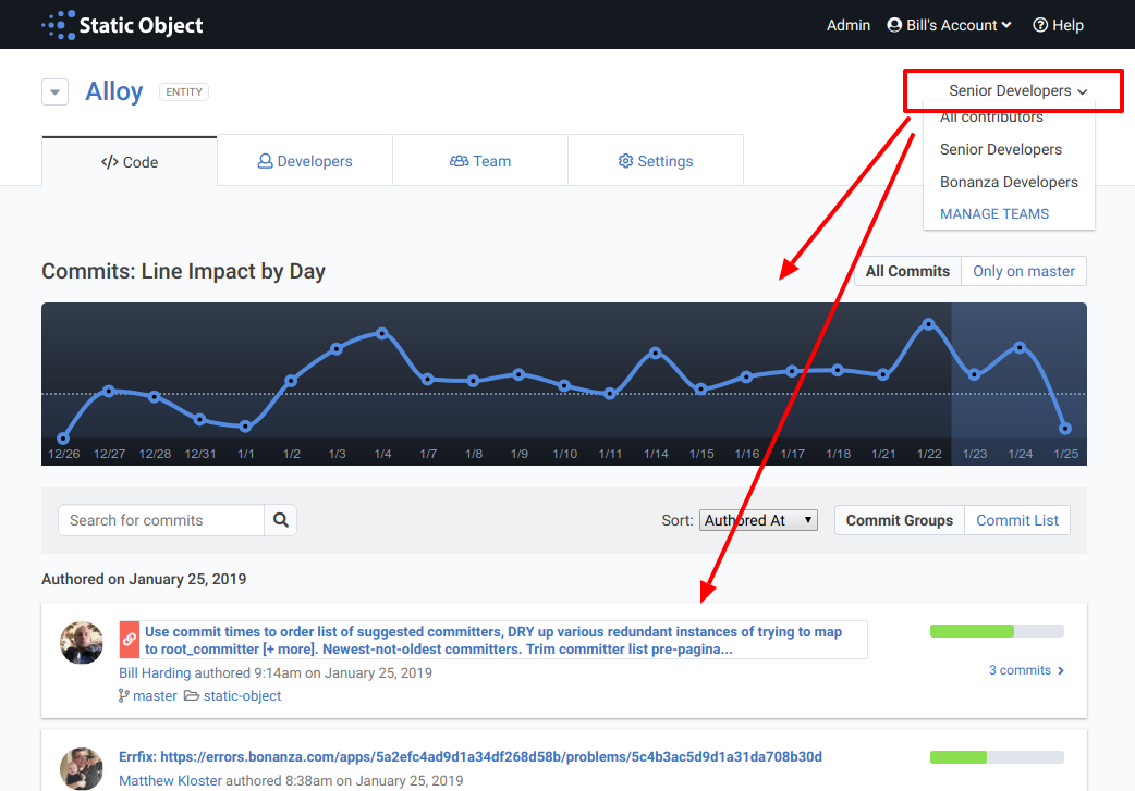 Both the Line Impact by Day, along with the commits themselves, consist only of those made by the Senior Developers team. Since our context is our company ("Alloy"), this shows commits from Senior Developers across the entire company. If we instead wanted to only see commits from Senior Developers within Bonanza, we can choose that context instead: