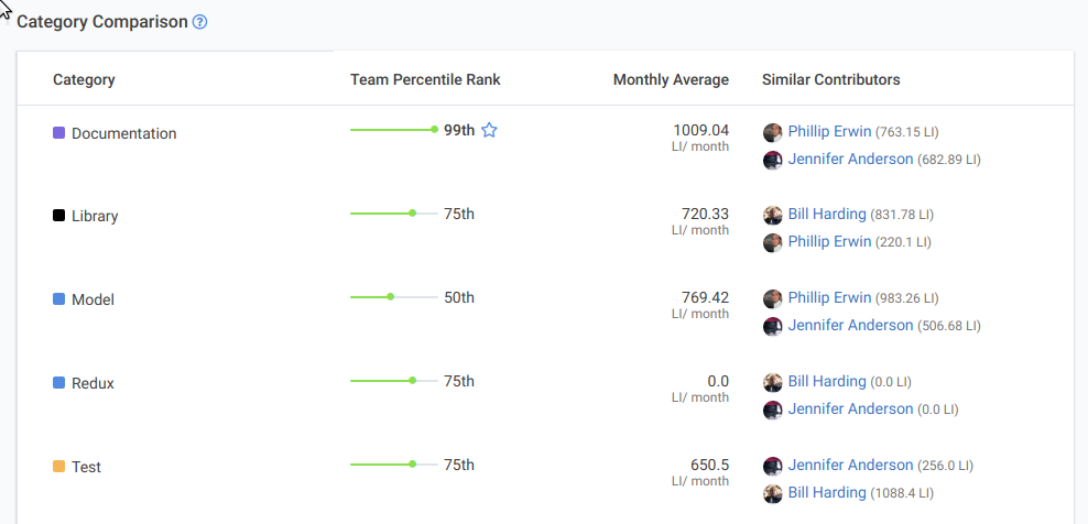 Another opportunity to leverage Teams can be found on the Performance Review page. Here, you can assess how proficient a developer is in certain types of code relative to their peers: