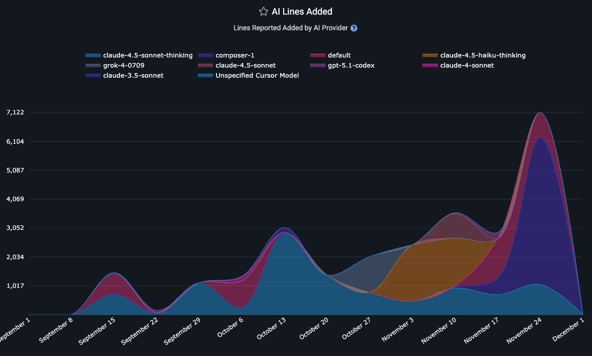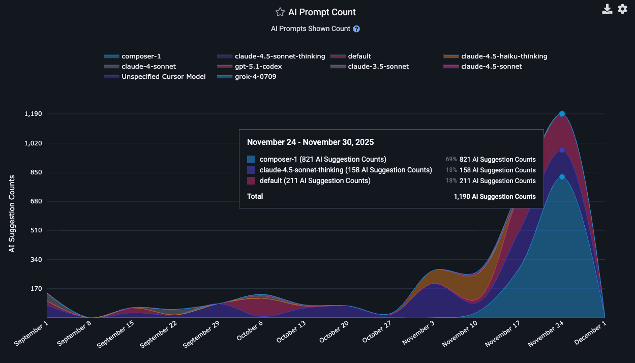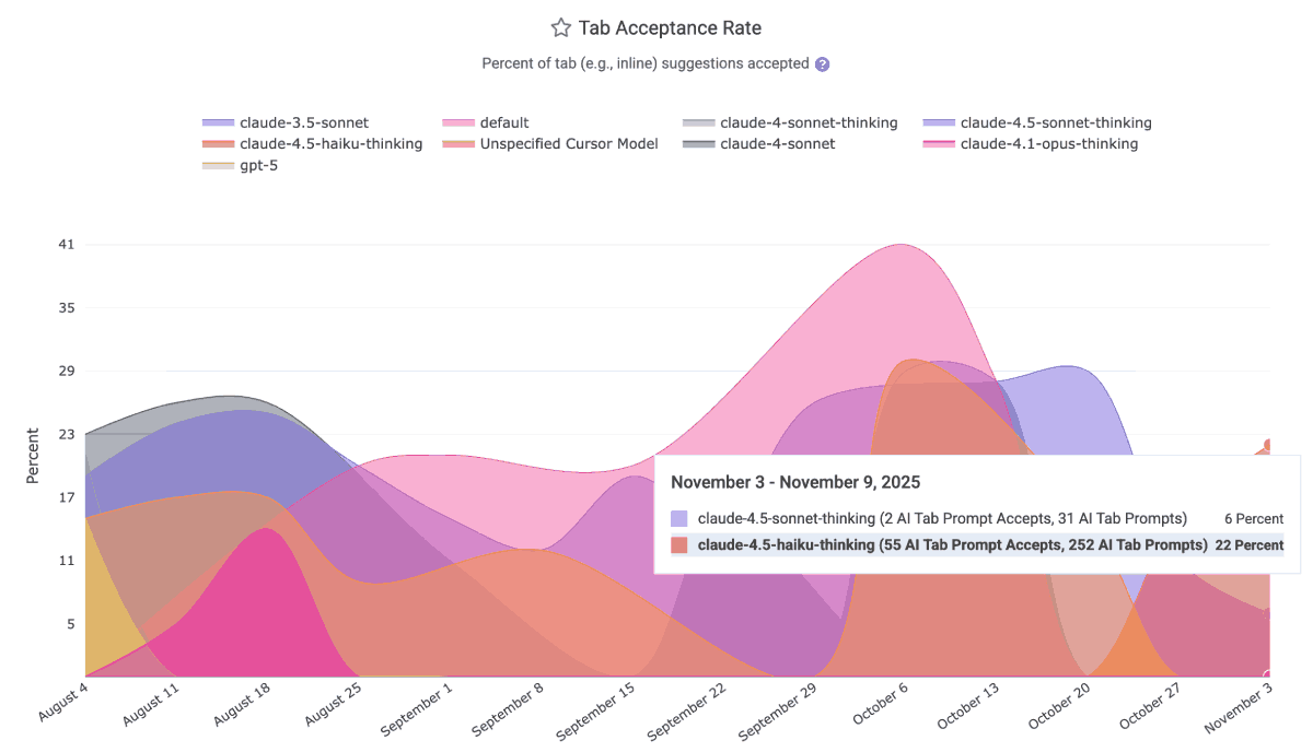 This data is ideal for helping to disseminate within a team which LLMs have been producing the most applicable results over the past month. It is available via the Reporting API as ai_prompt_acceptance_percent and ai_tab_acceptance_percent. The per-model data is available to all AI providers except the default GitHub Copilot business tier, which labels all LLM acceptances as "Default Model" as of Q4 2025.