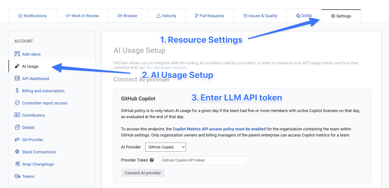 To connect to an AI provider, visit the "Settings" tab for your resource and choose "AI Usage"