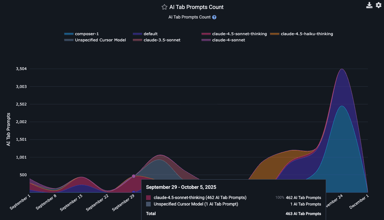 In terms of specific technical details, Copilot derives the "Prompt Suggestion Count" by summing total_code_suggestions per-editor, per-model. Cursor gets it by summing together "chat requests," "composer requests," "agent requests," "applied suggestions," "accepted suggestions," and "rejected suggestions" to get a grand total of requests (=> suggestions) and opportunities the user had to accept a suggestion.