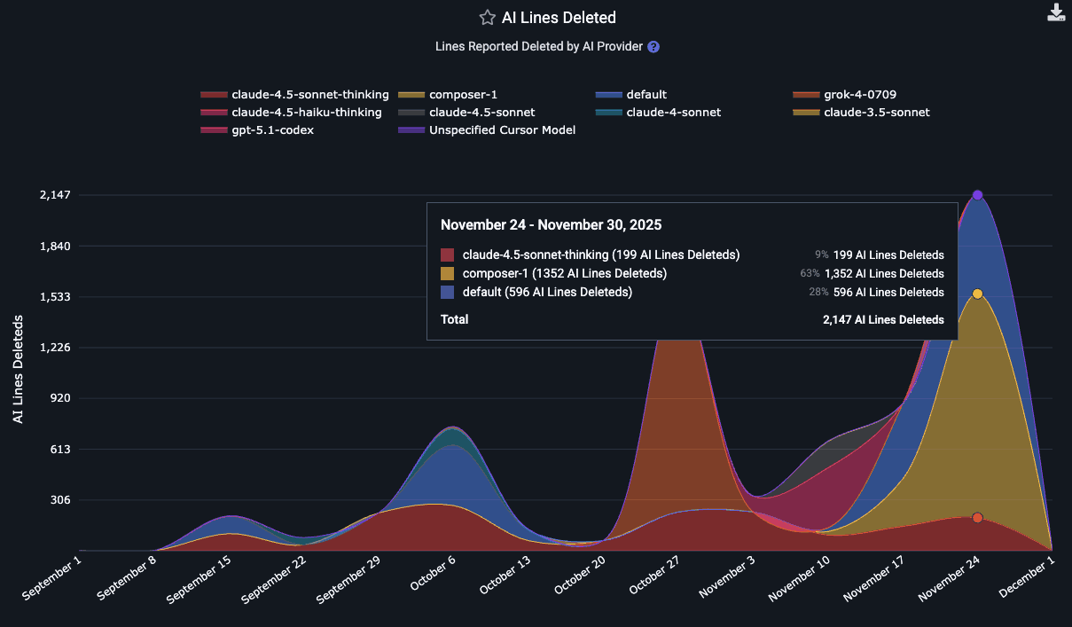 Typically, the "Lines added" are around 5x the "Lines deleted" for LLMs of the mid-2020s. Some day hopefully they will better figure out how to effectively recommend code deletion opportunities, since it is such a key to long-term repo health.