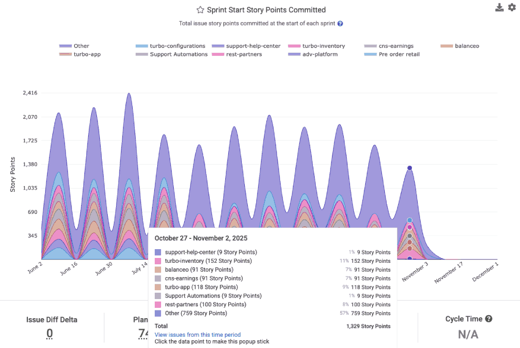 GitClear offers a number of sprint stats under the "Issues" tab and "Sprint Stats" sub-tab. These stats are available to any user who has connected to a Jira instance with sprint data.