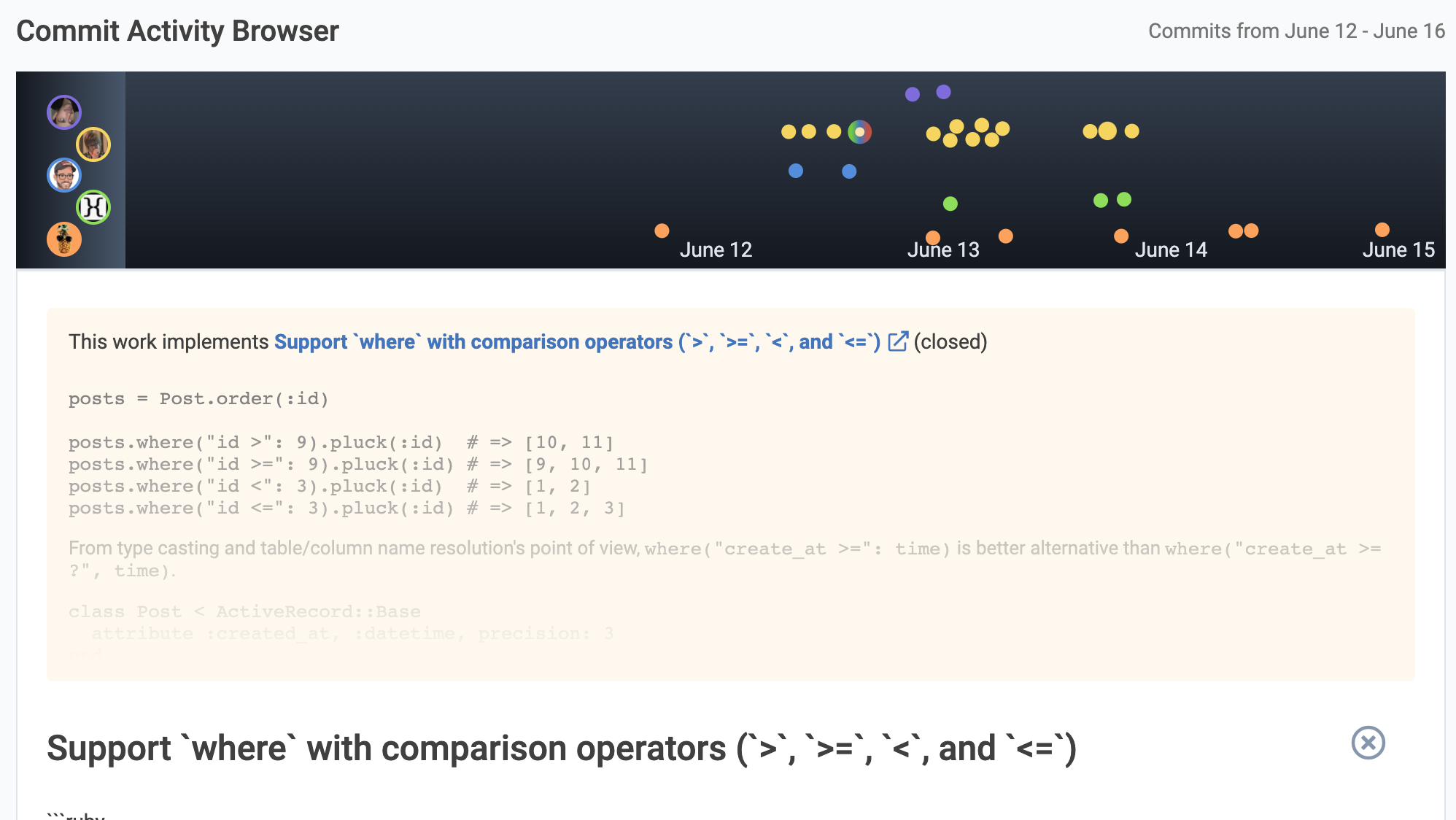 One of the biggest problems with the last generation of diff viewers is trying to keep a sense for how a particular commit relates to the full set of commits in the repo or the company.