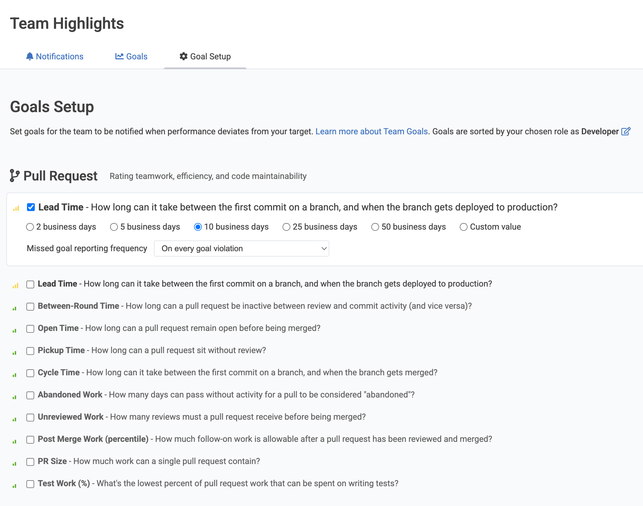 When you choose Team Goals that pertain to pull requests, these thresholds will be used as applicable to determine when a notification is sent