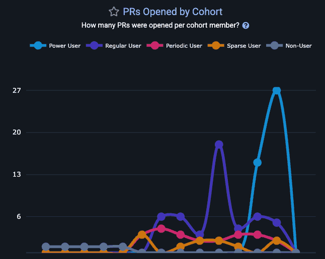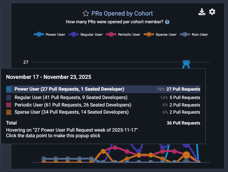 Use the "PRs Opened by Cohort" to understand the relation between "AI usage" and "tendency to open pull requests for review." It's not uncommon to find that the most avid AI user(s) will have an outsized impact on the total progress by the team, as can be seen upon hovering on a cohort: