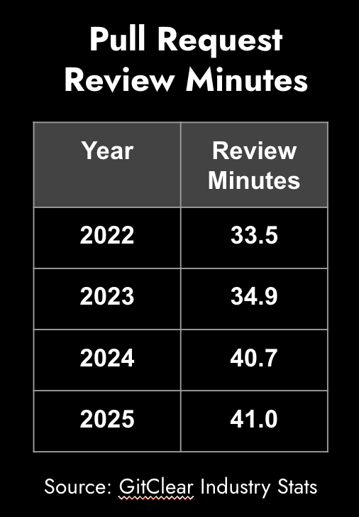 Often, yes. Research by GitClear and others have variously estimated the code review burden to have increased by 20-80% since pre-AI. That said, the correlation with "more time spent reviewing" could also be attributed to the greater prevalence of remote work, if such work results in developers becoming less aware of the domains in which their teammates are contributing. The Teammates Review Minutes per AI Cohort helps teams tease apart whether lengthy PR reviews are more common among developers with heavy AI use.