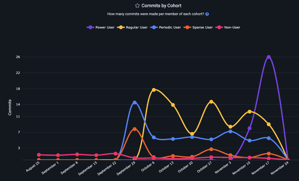 A conventional productivity metric that has shown pronounced growth during the AI era, the Commits by AI Cohort reveals the extent to which AI usage is allowing developers to author a greater volume of commits.