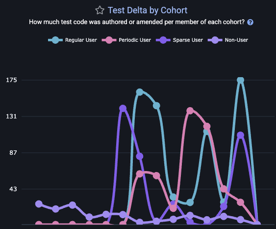 The Churn Lines by Cohort instruments the volume of churn for each tier of AI usage. AI has cultivated something of a reputation for generating lines that seem alright to a first glance, but later prove to require changes in order to operate as expected. If you find your highest tier AI users are also 2x or more likely to churn their code, it may be worth a conversation about taking more time to self-review one's work before pushing it to the repo.