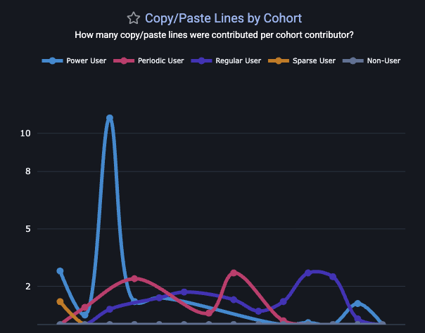 The Copy/Paste Cohort graph lets you understand both "the extent to which AI is directly contributing to more copy/paste" and "when (on what tickets/project) is the copy/paste duplication occurring?" If unrealistic deadlines are a concern for a team, managers may find developers more willing to reduce their self-review on behalf of delivering a "resolved" ticket faster, even if that means seeding tech debt for future maintainers.