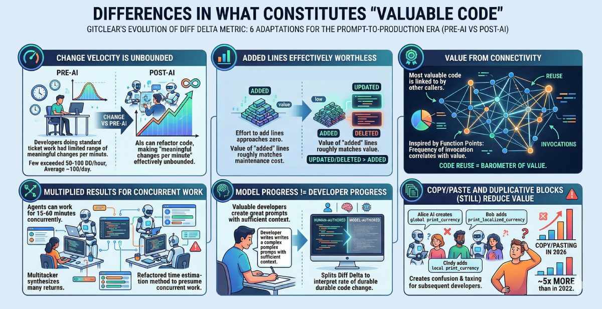 Valuable developers are engines that create great prompts. A "great prompt" is one crafted with sufficient context to fuse with the existing framework, yielding as few new lines of code as possible. To interpret the developer's "rate of durable code change," GitClear now splits Diff Delta between a "human-authored" fraction and a "model-authored" fraction. This helps managers recognize whose prompts are creating the greatest positive impact, to learn what techniques and models are being used.