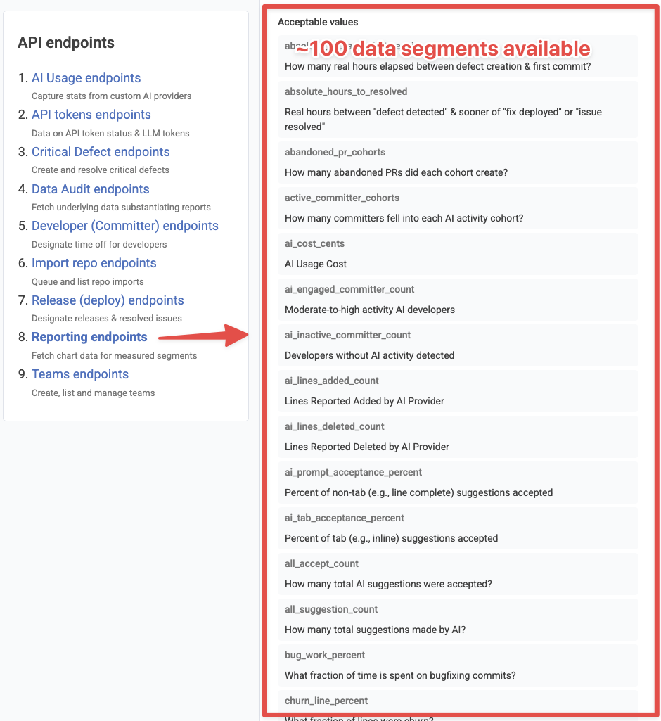 There are two straightforward options to retrieve any GitClear data in a structured format. Many GitClear customers use data exporting to feed the chart segments to an LLM for analysis of how recent activity compares to historical norms, or to industry benchmarks.