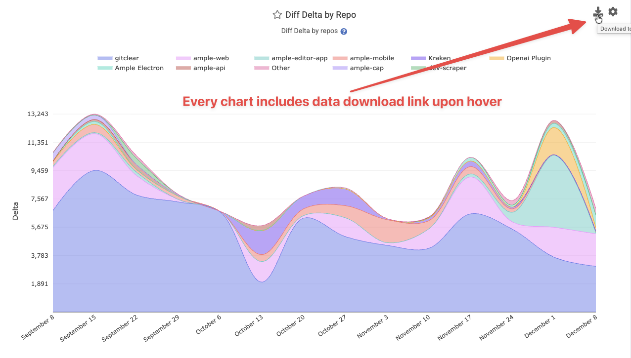 This will instantly generate a downloadable CSV file that breaks out each segment in the chart, given the input parameters: resource (entity, organization, or repo), date range, and team. It will also export data on the team's median value, or the industry benchmark value, if those options are enable in chart settings.