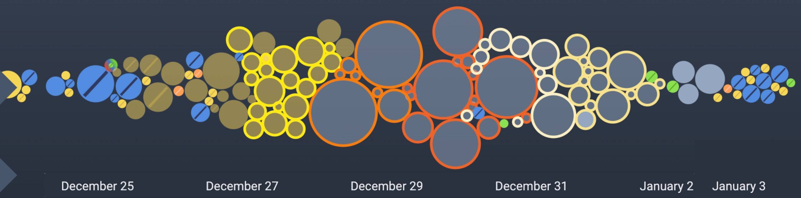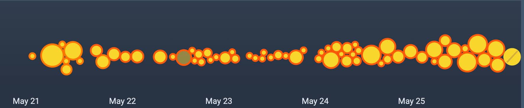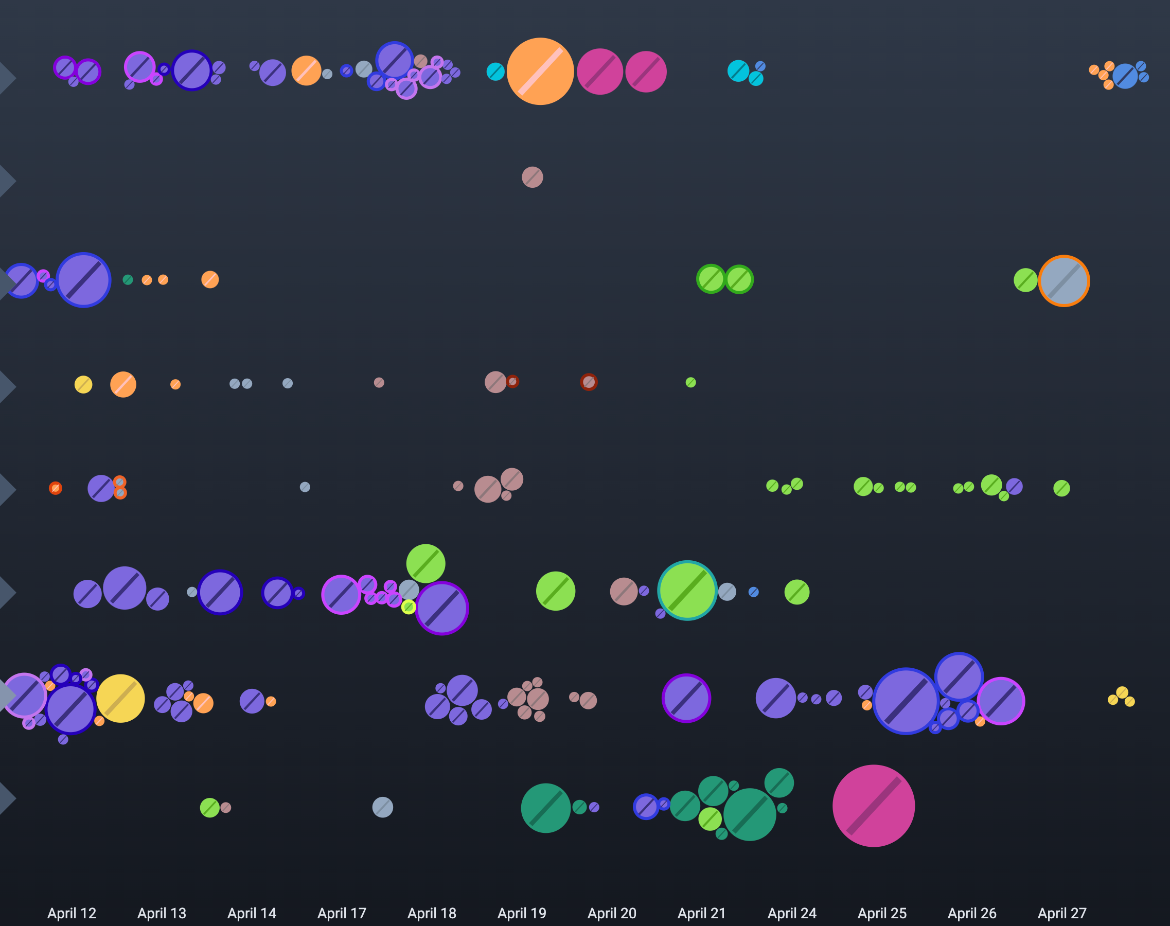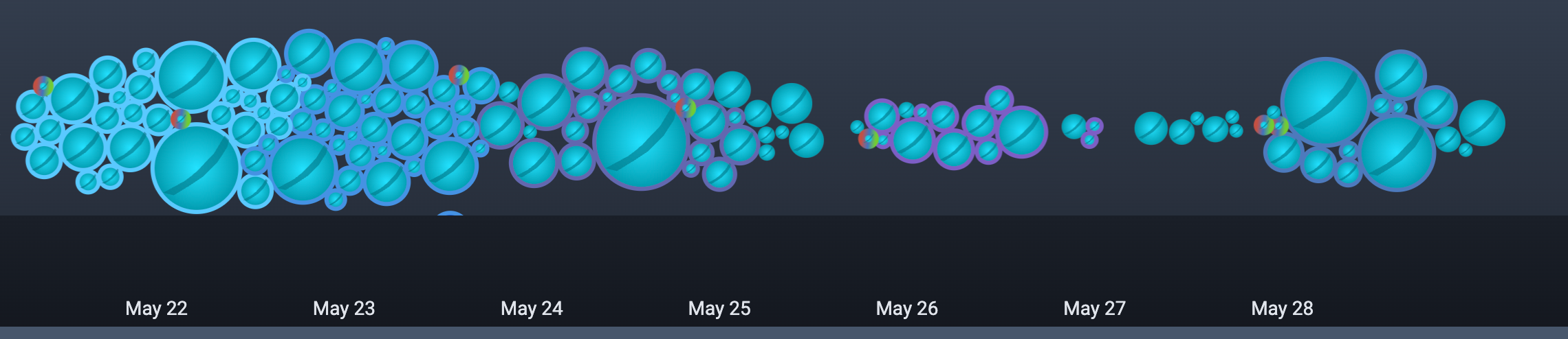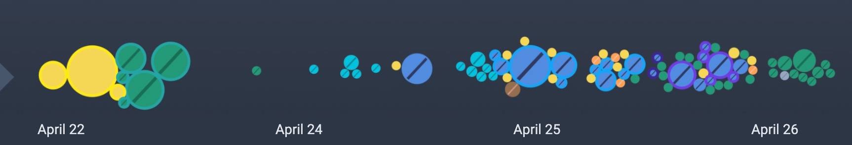 The signature of fast iteration is lots of small bubbles grouped together. This typically indicates that the developer is making many commits that revise recent work. If a new featured launched recently, the packed circles suggests that bug fixing is happening concurrently with development. This is generally a phenomenon one wants to see in order to deliver a polished product.