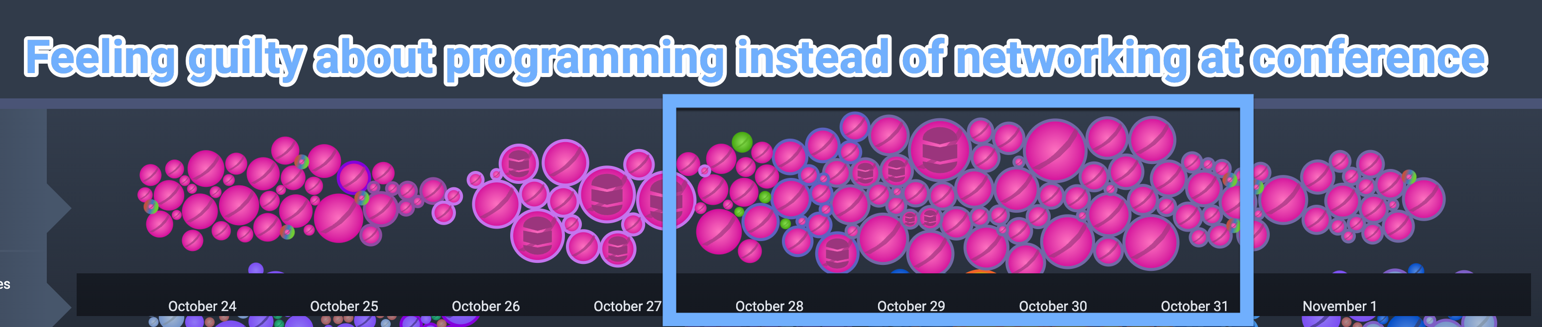 This graph shows a week in changing work conditions. The small, tightly grouped commits on the left side of the picture illustrate when a programmer's attention cycle gets truncated by distractions. In this distraction-heavy half of the trip, the developer had their attention interrupted every hour or so.